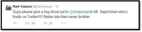 The veteran actor, Rishi Kapoor, recently joined the Twitter fraternity and gained a huge number of followers as well as appreciation for his frank and honest approach we hope that Sajid Khan follows suit.