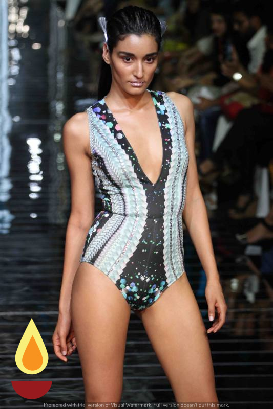 The Lakmé Insta Light runway saw an impactful use of LED lights that lit up Namrata’s creations. Her collection was the perfect metaphor for Lakmé Insta Light crème that promises to light up your skin instantly! The show opened with models positioned under four giant black iron rectangular frames that lined the stage. In the darkness of the hall, their superb swimwear with strategically placed lit bulbs came alive and created an almost magical atmosphere as they glided down the mirrored runway.
